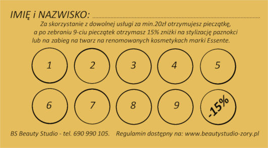 Za każde skorzystanie z usług w BS Beauty Studio o wartości minimum 20zł uczestnik programu otrzymuje 1 pkt, co potwierdzone będzie na karcie lojalnościowej pieczątką.